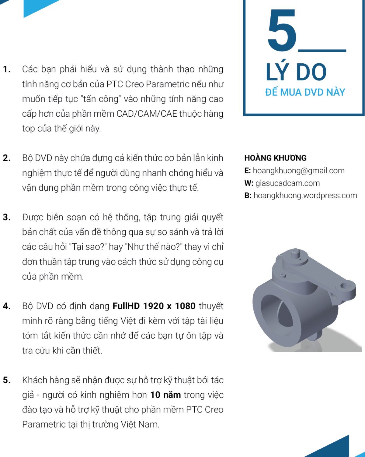 Hơn 10 năm đi dạy và hỗ trợ kỹ thuật cho phần mềm PTC Creo Parametric, tôi đã tích lũy được rất nhiều kinh nghiệm và mang kinh nghiệm đó biên soạn thành bộ DVD Thiết kế cơ bản với PTC Creo Parametric 3.0 với hy vọng giúp các bạn vượt qua những khó khăn ban đầu khi tiếp xúc với phần mềm này.
